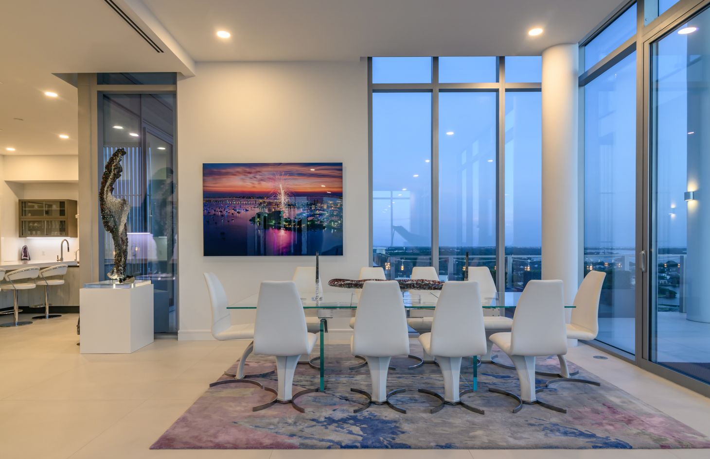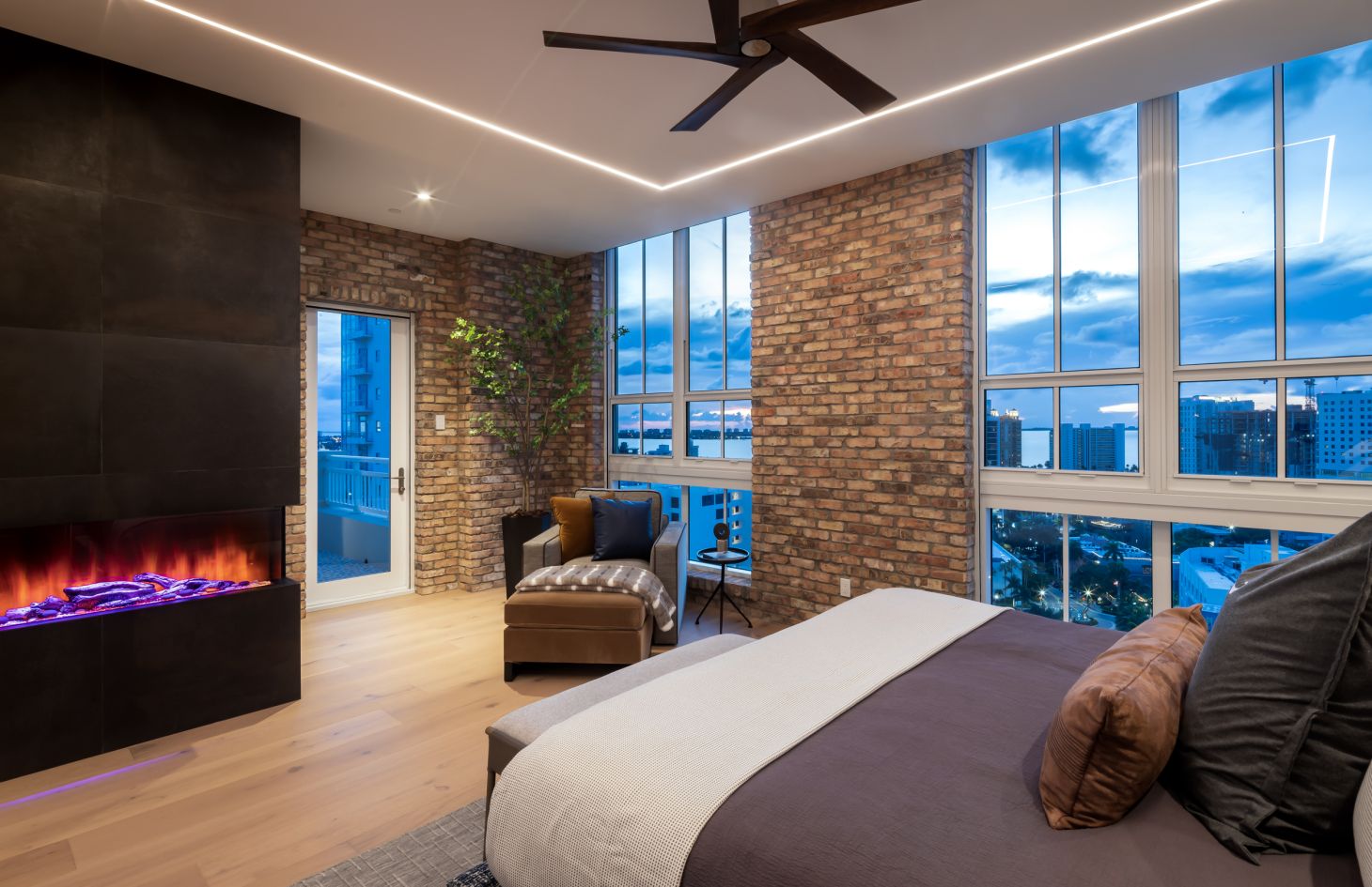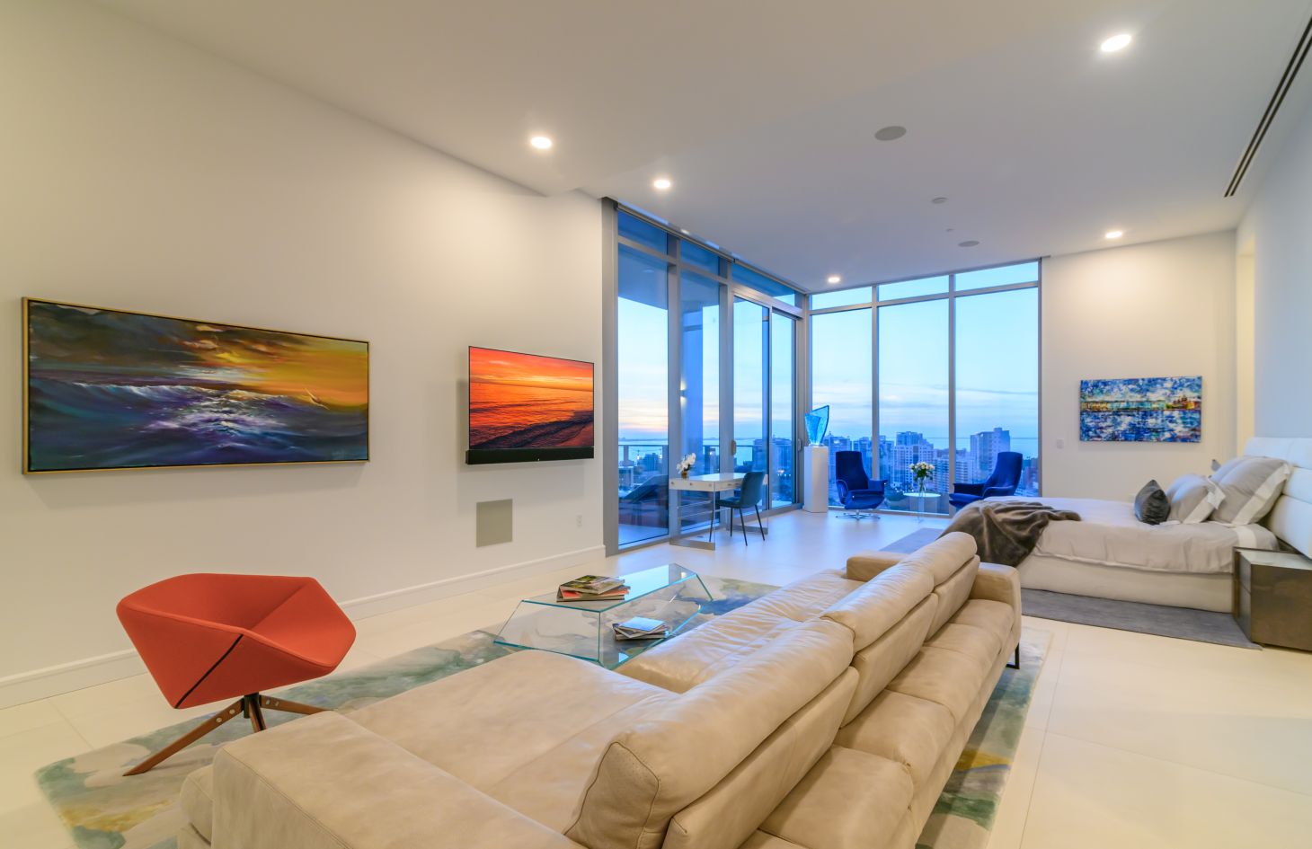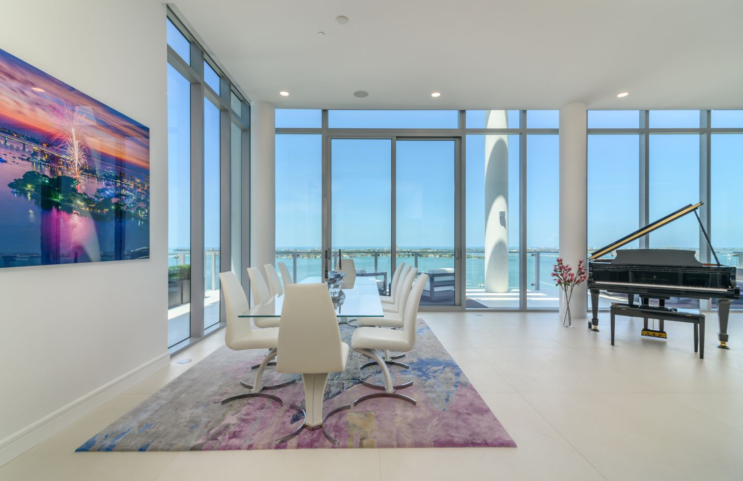 The design philosophy of the penthouse is centered around capturing the essence of its breathtaking surroundings. Dramatic walls of glass frame the living spaces, allowing natural light to flood in and offering uninterrupted vistas of the endless bay views that lie beyond. Adding an extra layer of sophistication and practicality, Lutron motorized shades have been thoughtfully installed throughout the penthouse. With just a touch, you can adjust the shades to create the perfect ambiance, whether you desire a softly lit sanctuary or an open, sun-soaked retreat.