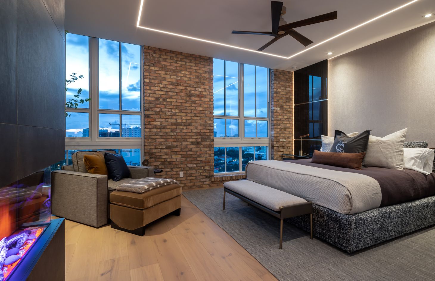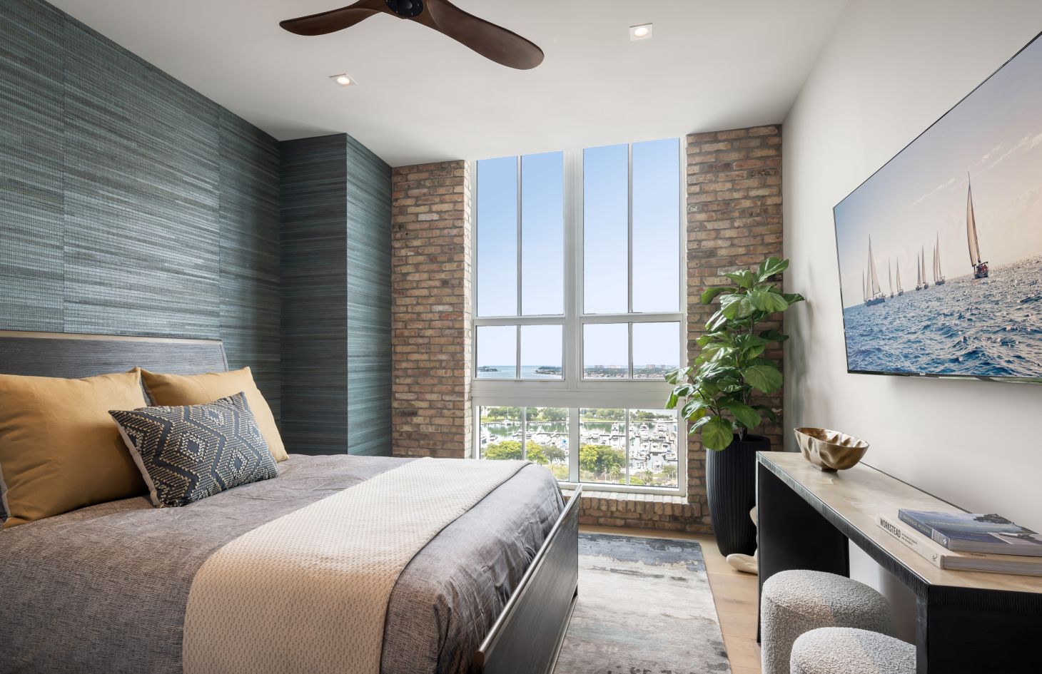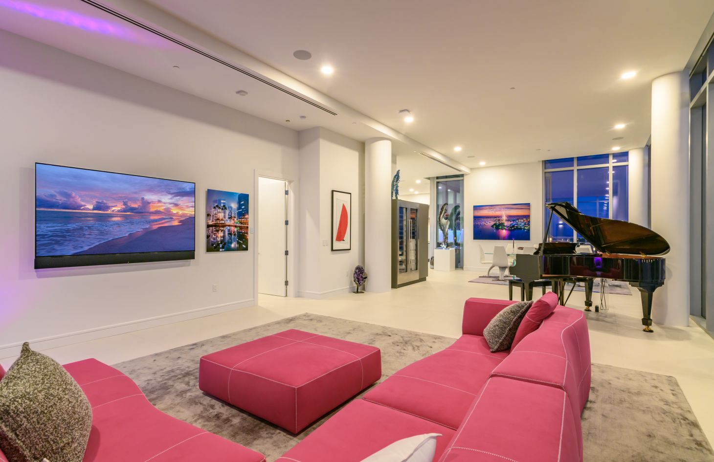 The design philosophy of the penthouse is centered around capturing the essence of its breathtaking surroundings. Dramatic walls of glass frame the living spaces, allowing natural light to flood in and offering uninterrupted vistas of the endless bay views that lie beyond. Adding an extra layer of sophistication and practicality, Lutron motorized shades have been thoughtfully installed throughout the penthouse. With just a touch, you can adjust the shades to create the perfect ambiance, whether you desire a softly lit sanctuary or an open, sun-soaked retreat.